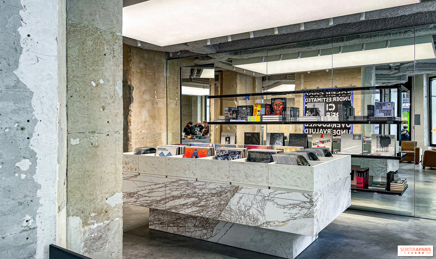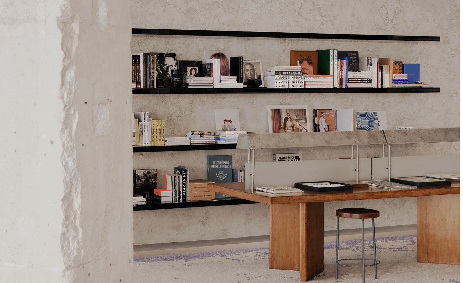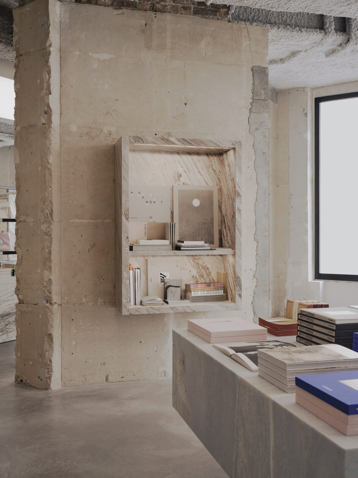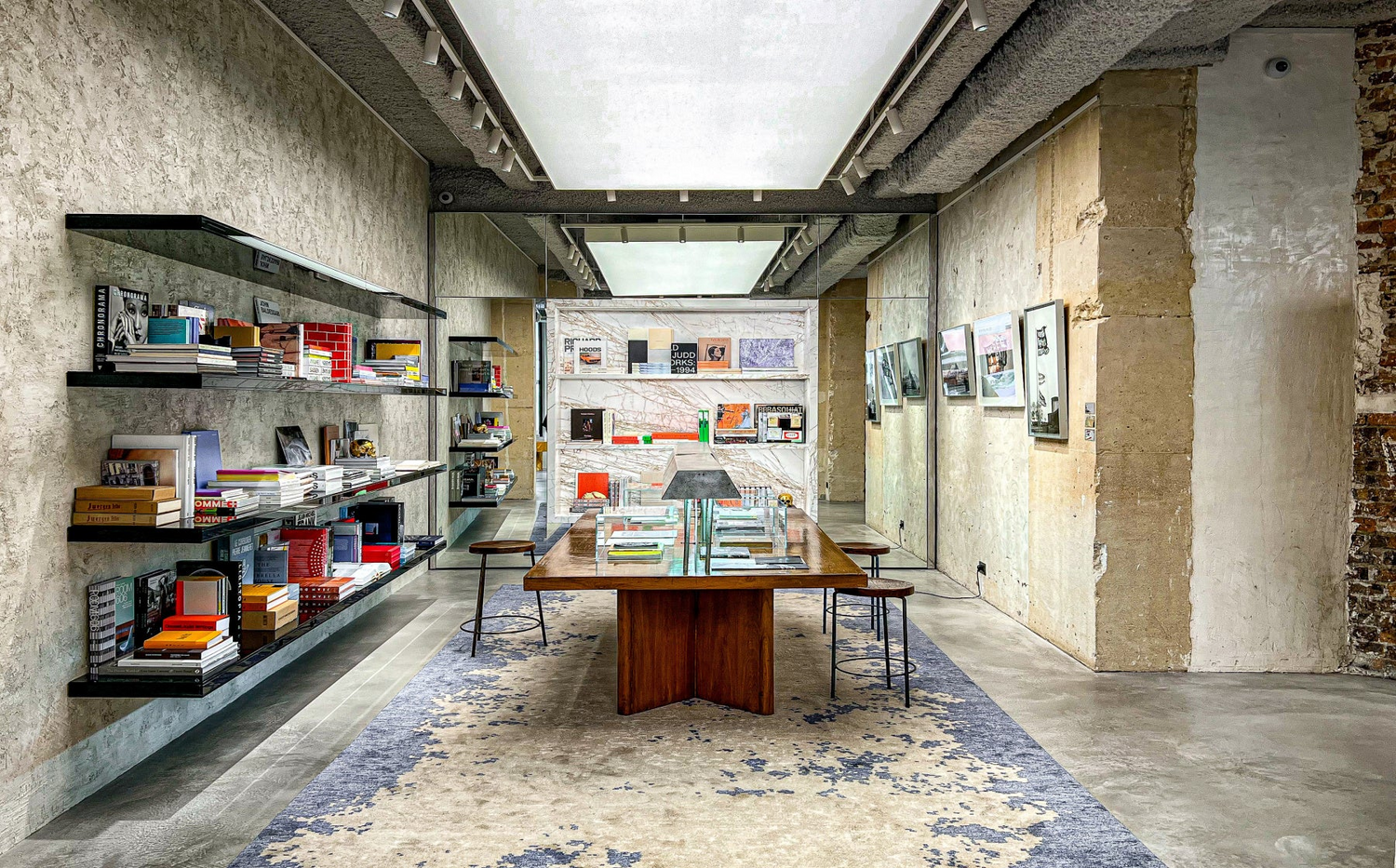 Inside, the store showcases a meticulously curated collection of books, prints, and volumes, arranged on minimalist marble countertops in soft cream and white shades that resonate with the surrounding Haussmannian architecture. The textural landscape is enhanced by a large rug in dusk blue and white, along with a simple wooden table intended for jotting down fleeting ideas. The walls, stripped back to reveal off-white plaster, lend the space an industrial atmosphere, capturing Paris's rich literary and artistic heritage.