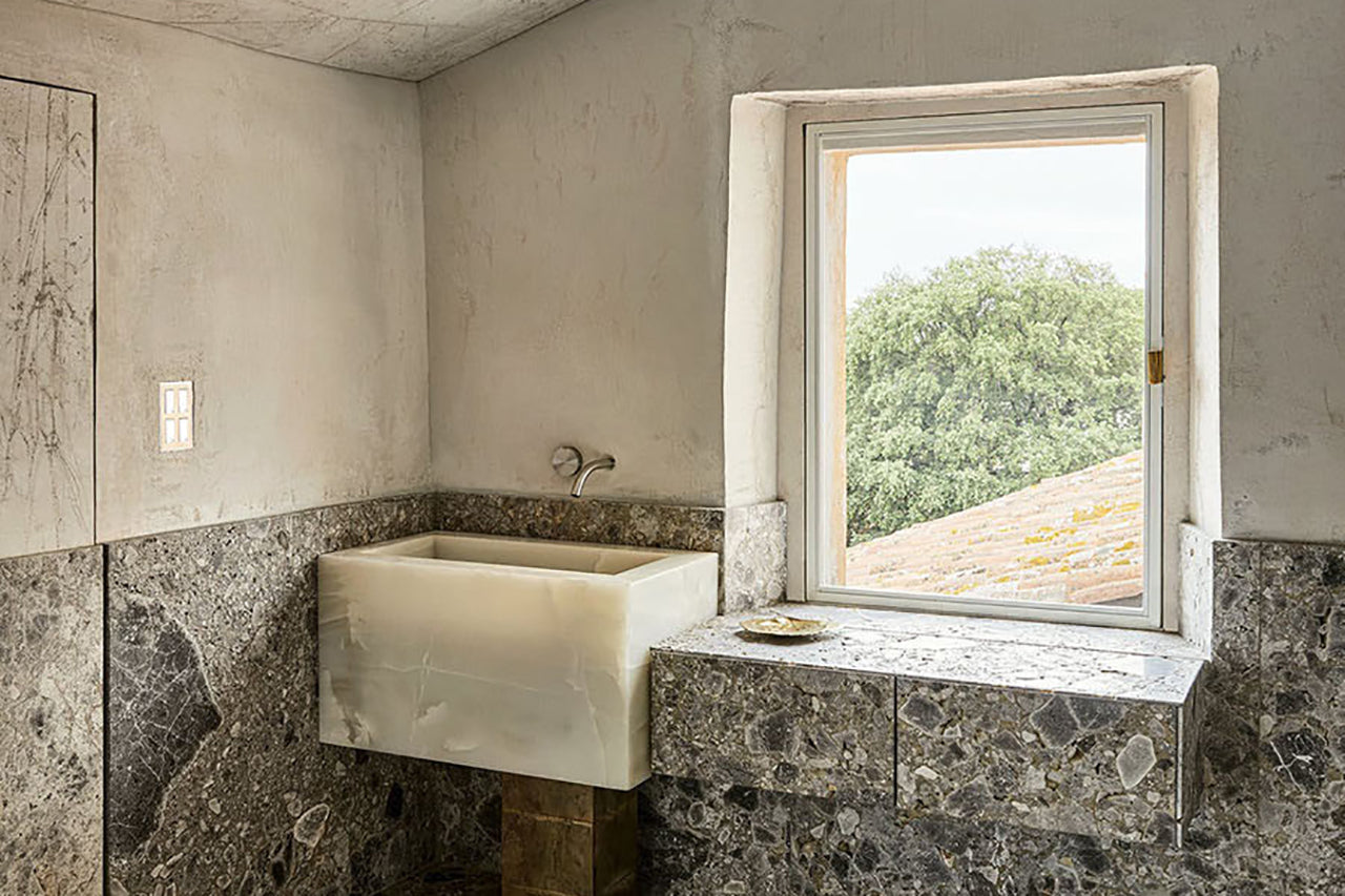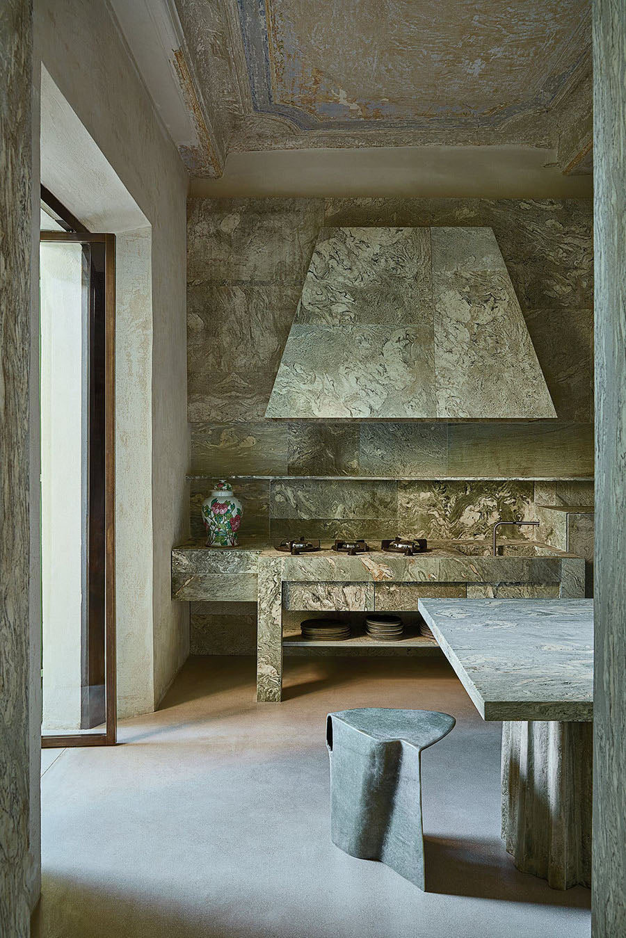 The elegant, minimalist style features historical accents and much of the furniture is his own design, creating balanced spaces that exude calm and strength. The exposed patina of walls and beams, along with a carefully curated palette of cool greens and warm brick tones, enhances the atmosphere. Local marble and Belgian sanded linen replicate the textures of the original structure, highlighting the region's craftsmanship.