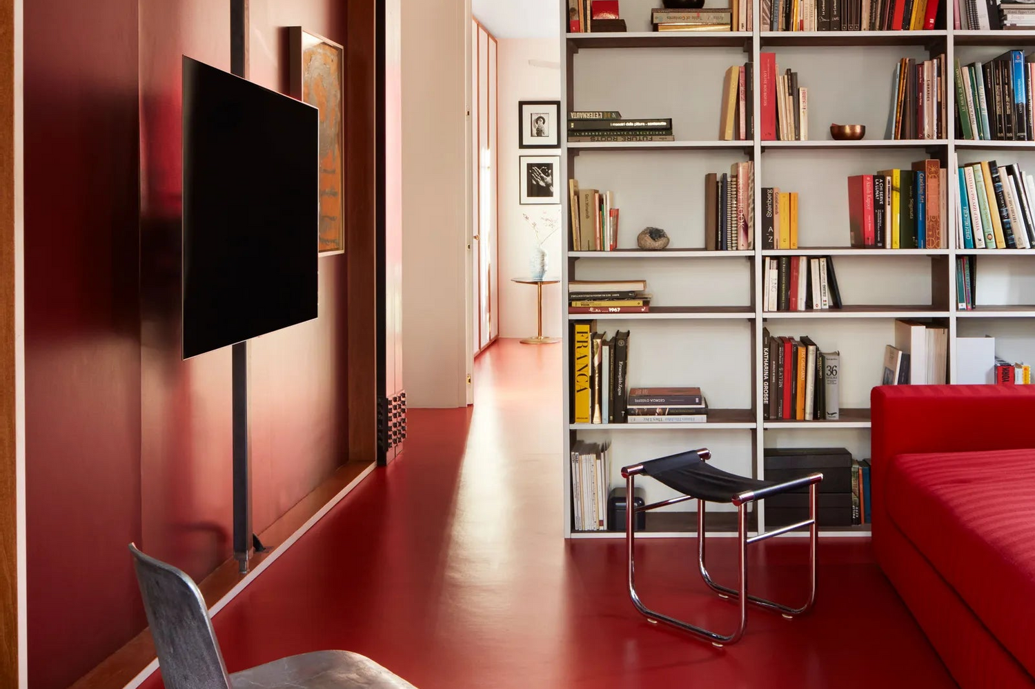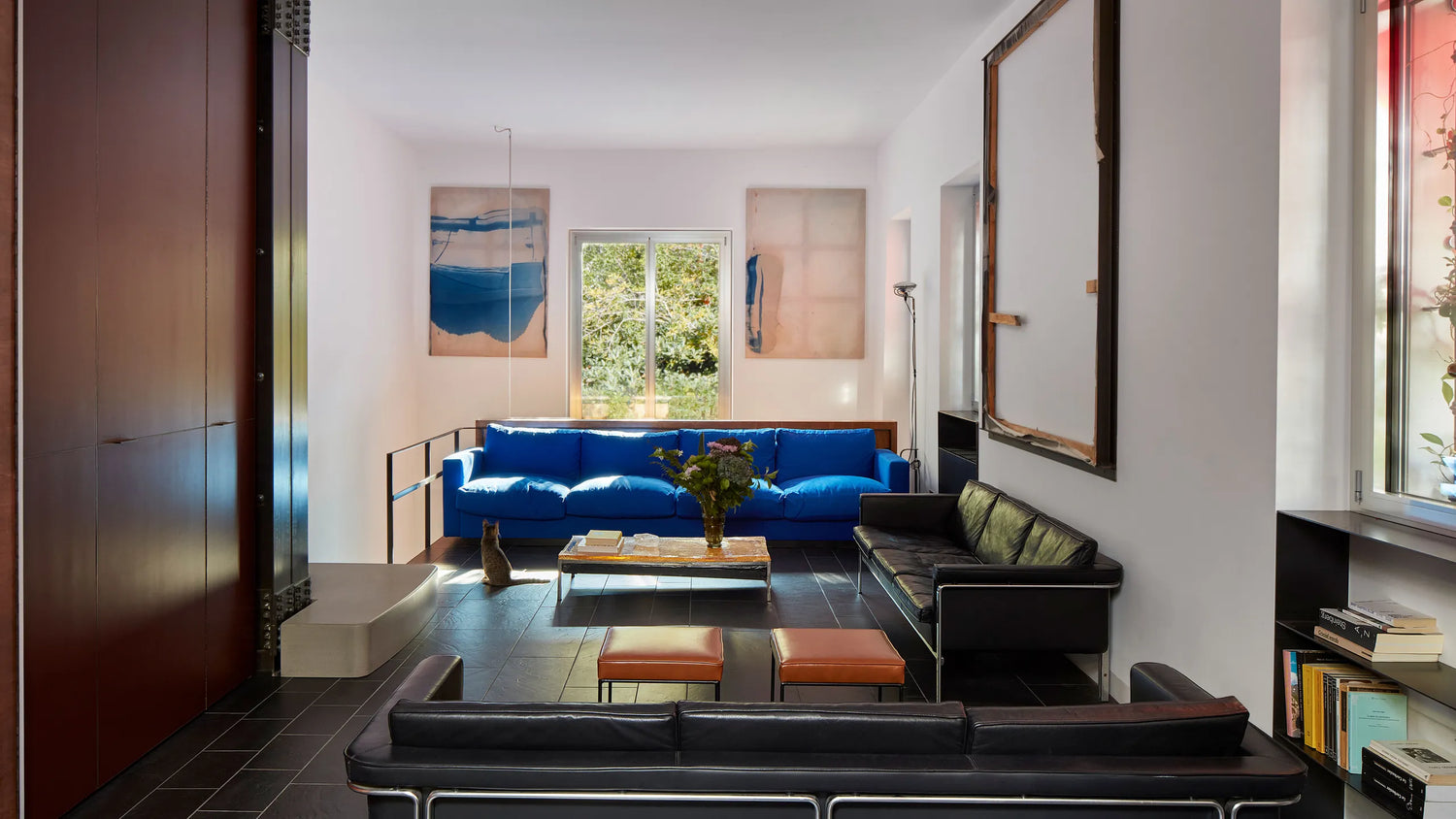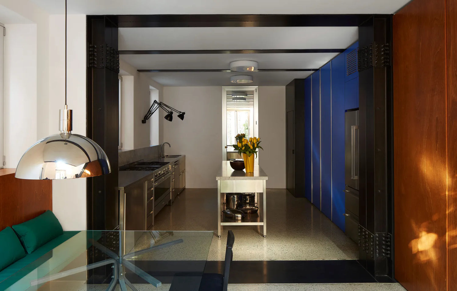Rather than becoming engrossed in the unexpectedly pastoral scenery outside, it is essential to examine the window frame and pull. The frame is made from a stark, surgical-grade aluminum, which is not only sharply contemporary but also ideal for regulating Milan's varied temperatures. In contrast, the vintage brass pulls, designed in the 1950s by esteemed Milanese architect Luigi Caccia Dominioni, introduce a nostalgic element. Locatelli elucidates, “Incorporating a gentle reminder of the past into these rigid windows serves to foster a dialogue between historical and modern elements, as well as classic and contemporary design.” He further highlights the pleasing contrast of metals, comparing it to a Cartier Trinity ring.
