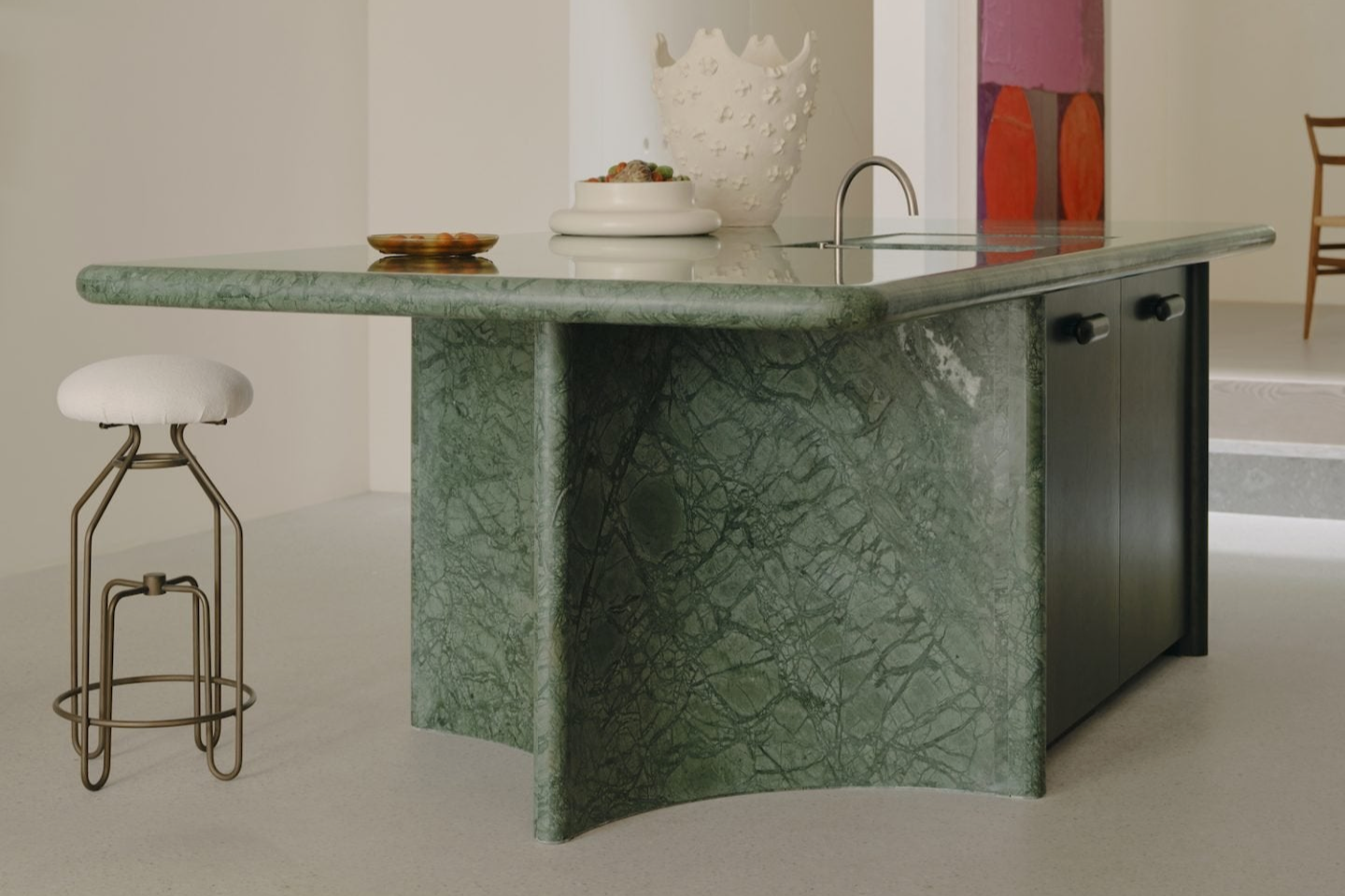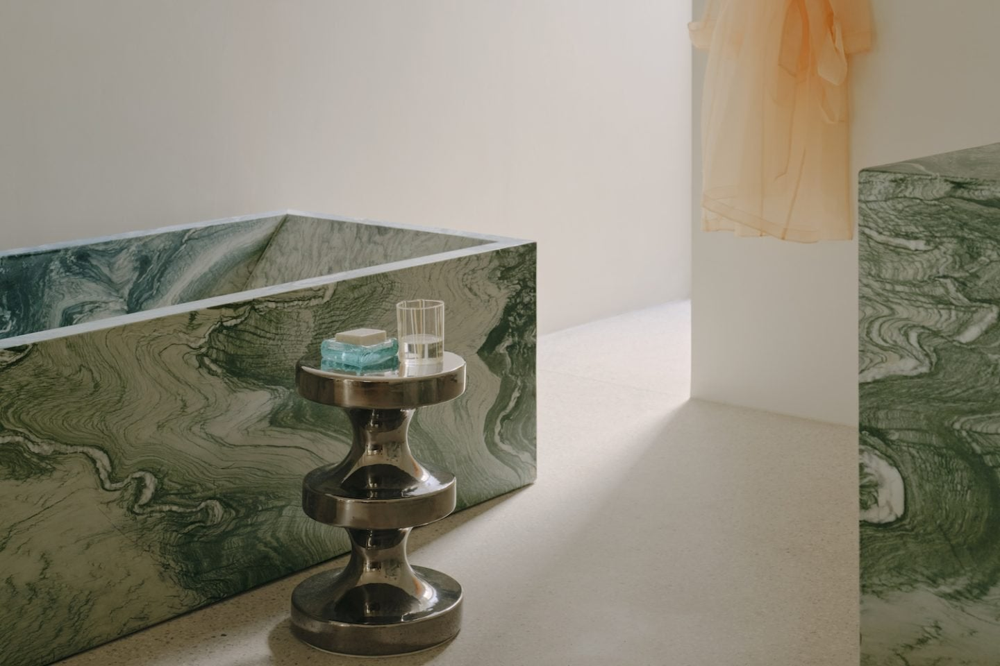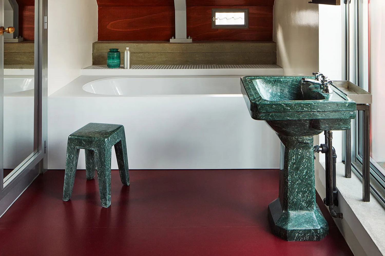 Bousquet transformed this two-floor, one-bedroom space on the Left Bank’s Quai de la Tournelle for a gallery-owning client. The 17th-century building, which “lacked grandeur and finesse,” was stripped to its bare structure and completely reimagined. The ground floor now includes an open kitchen, dining, and living area that opens onto a courtyard with a wall of green tiles creating the illusion of infinite greenery.