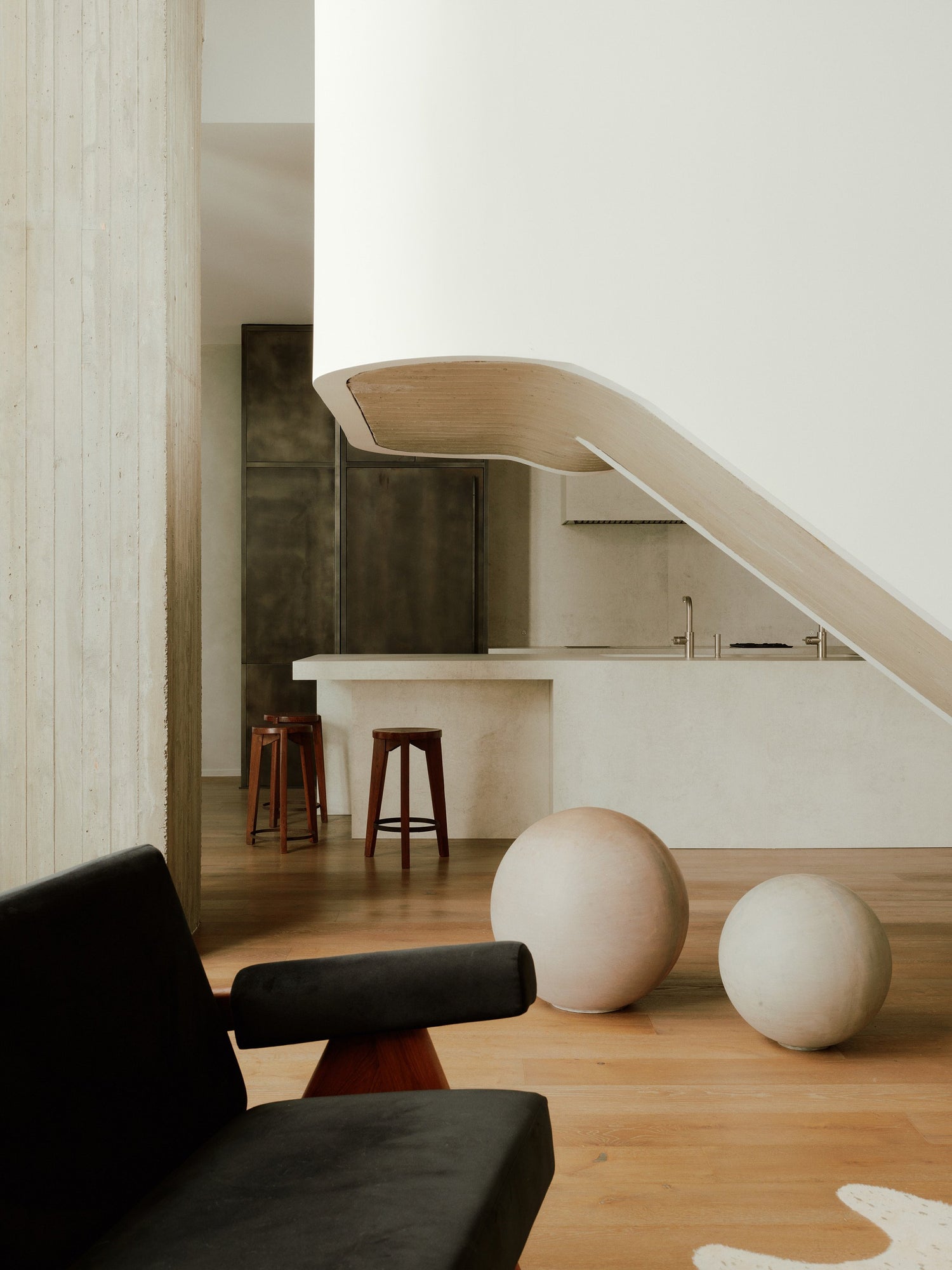 In her description of the interior, Joo highlights the space's robust and unrefined character, enhanced by distinctive architectural features, including a gracefully curved staircase, layered concrete ceilings, and textured columns. “The area exudes a strong, raw vibe, accentuated by bold architectural details such as the curved staircase, layered concrete ceilings, and textured columns,” states Joo.