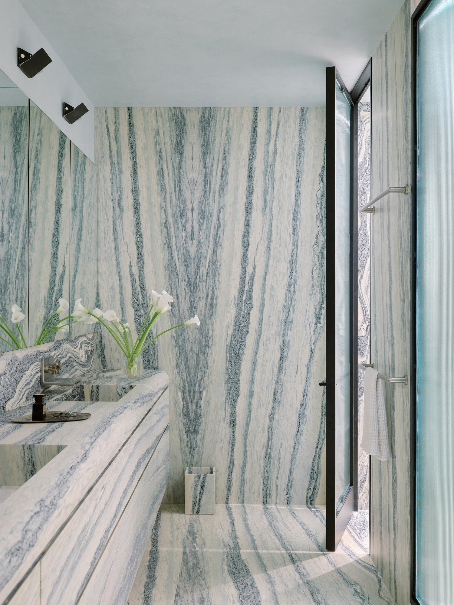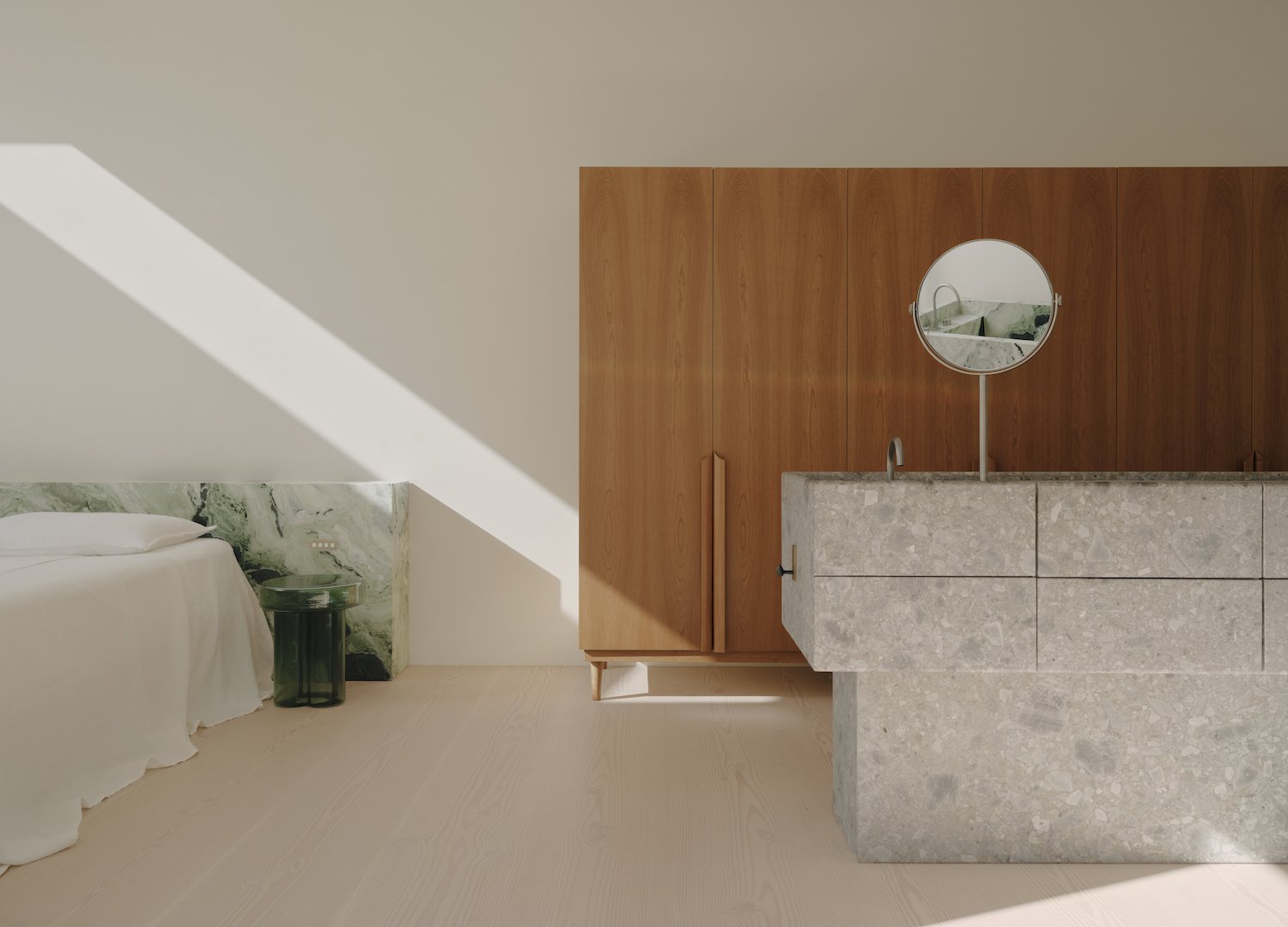 Tailored for a father and his two grown children, the residence is designed with privacy in mind, featuring four elegantly appointed bedroom suites. Each suite functions as a lavish, independent area that supports bathing, dressing, relaxing, and even entertaining. “By 5 o’clock, [the bedrooms] are ideal for hosting; each suite offers a pre-party setup, whether that's a bar cart or kitchenette,” remarks Josh Cain, principal and co-founder of Pattern Studio.