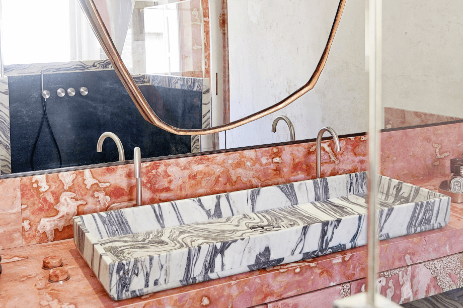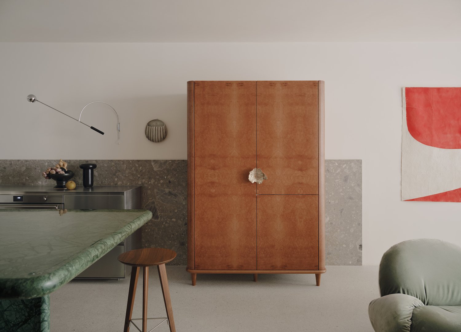 Throughout the house, especially within each bedroom, custom design features introduce charm and distinctiveness. Instead of conventional long walls lined with cabinets, Pattern Studio opted for tailored furnishings. For example, a built-in unit accommodates a record player next to a stone-clad bar, fostering an atmosphere ripe for enjoyment. Each bedroom boasts a unique bedhead, with designs ranging from the striking Verde Fantastico stone to soft upholstery and practical veneer wraps. In this context, the use of materials is exuberant; while the variety might risk appearing chaotic, under the careful guidance of Pattern Studio, the design remains cohesive and thoughtfully crafted.