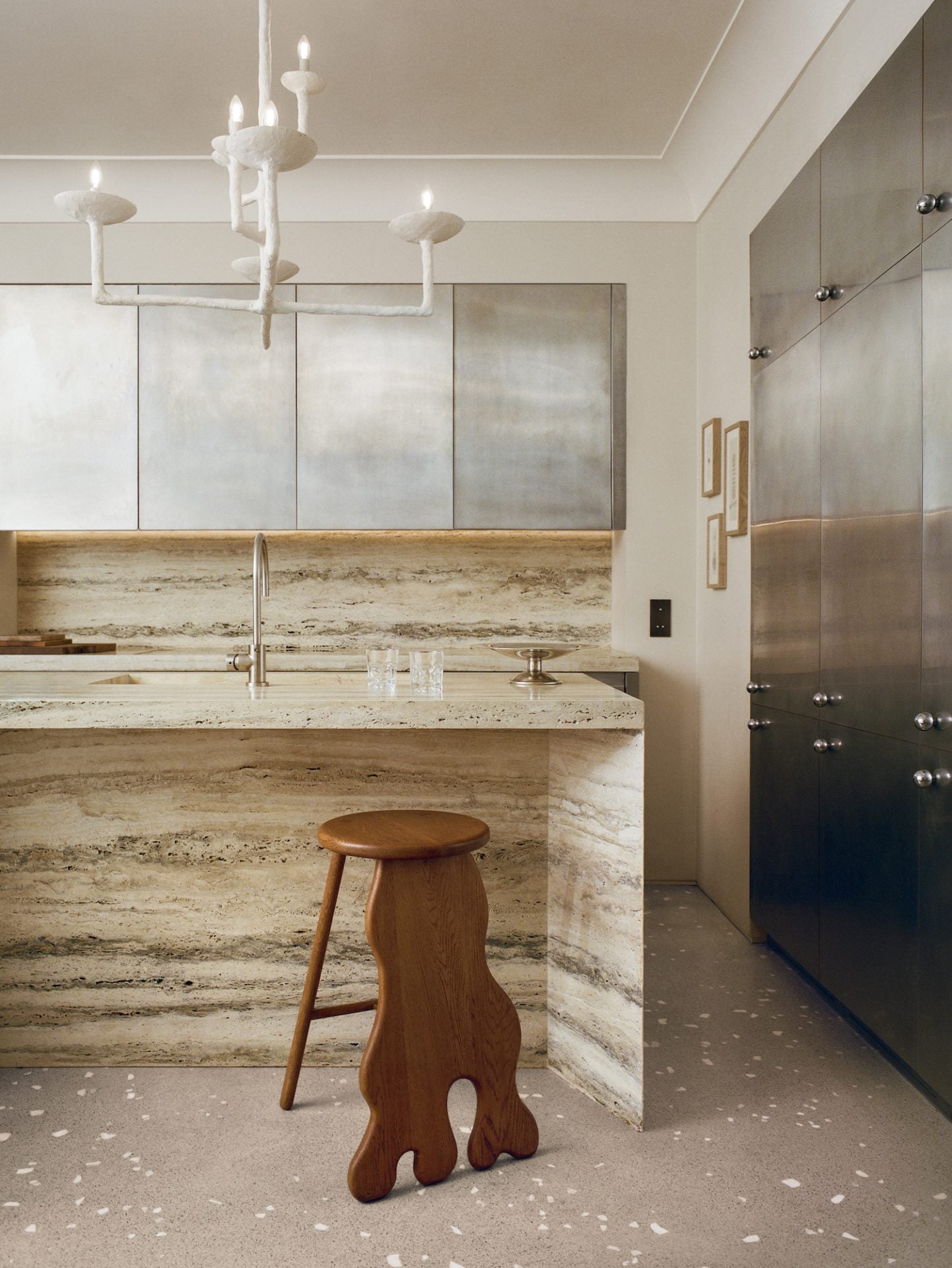 Covering nearly 4,000 square feet, this property includes three bedrooms and four-and-a-half bathrooms, selected for its ability to reflect the family's strong connections through its solid and inviting design. The clients’ inclination towards a neutral color scheme guided the design philosophy, which aimed to sustain a peaceful ambiance while introducing layers of depth and character, achieved through the careful incorporation of materials such as metal, stone, and plaster. The use of elements with a natural patina was pivotal in imparting a sense of history to the environment.