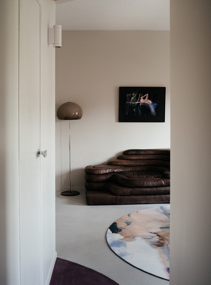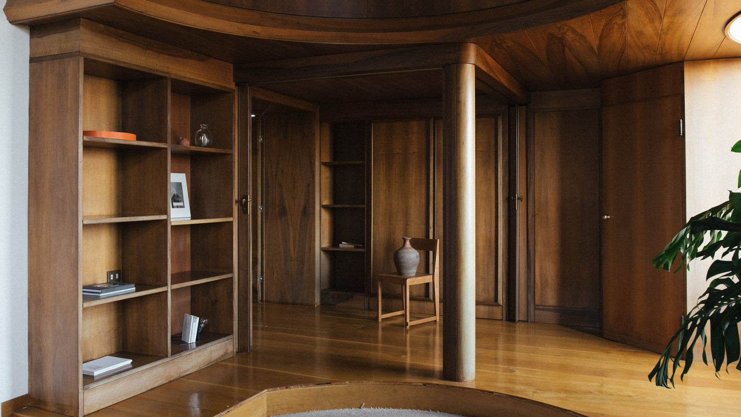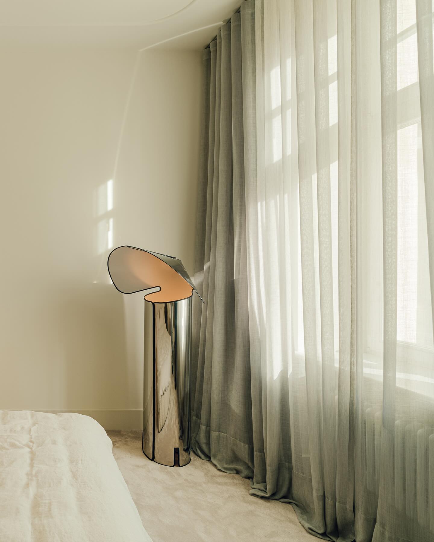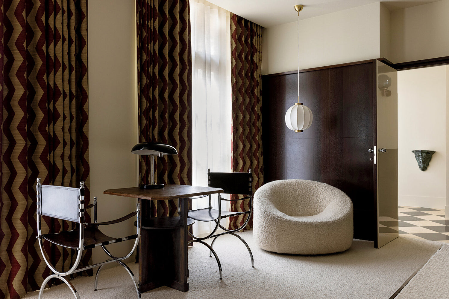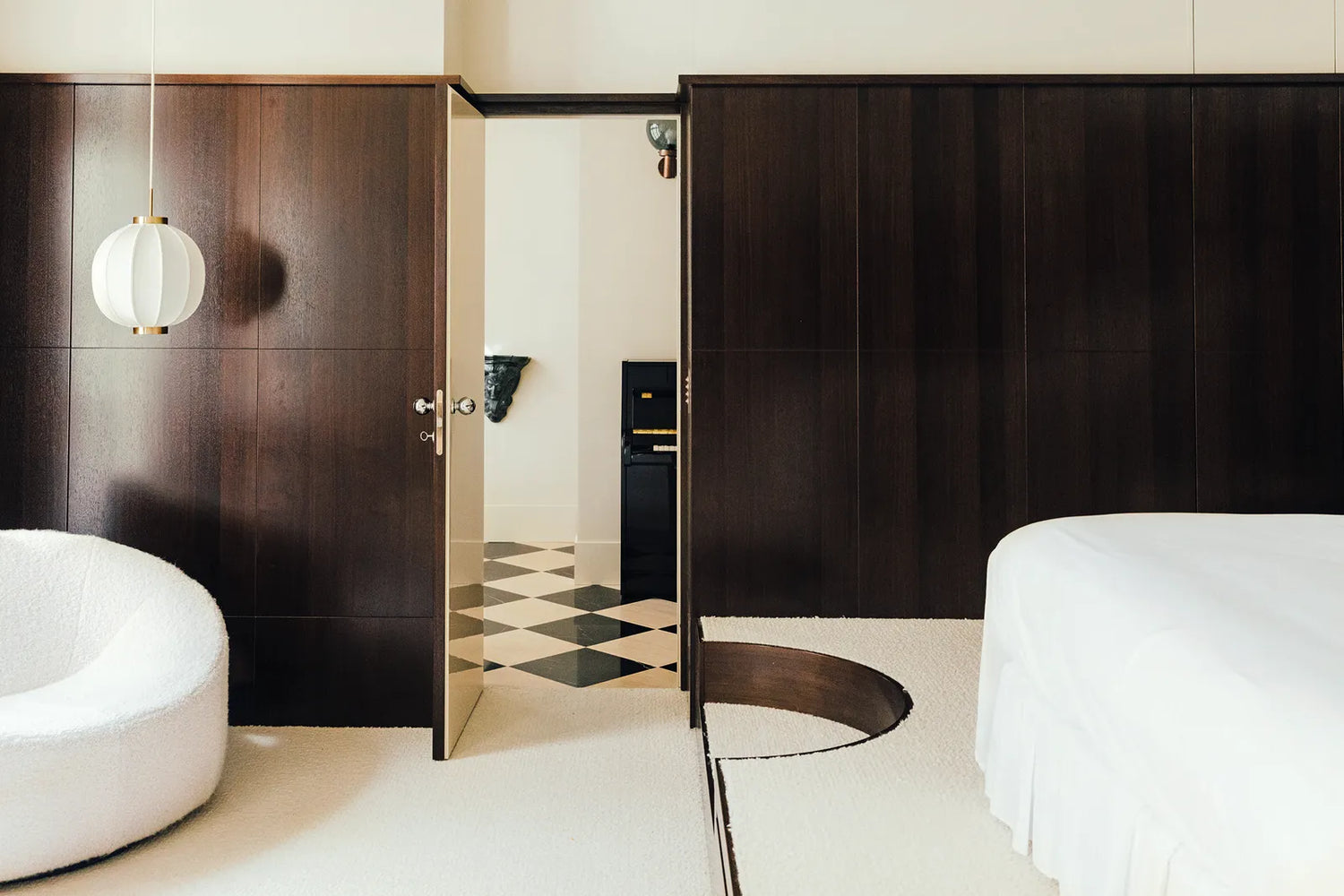 The duplex also incorporates a wealth of artistic and historical references. A plaster bust of a Roman figure and a sculpture of a Greek goddess add a classical dimension to the décor, while an Art Nouveau-style shelf in the entrance introduces an unexpected, whimsical touch. The main bedroom, located on the ground floor, balances dark wood paneling with softer tones, including a Pierre Paulin *Pumpkin* armchair and a bouclé wool carpet. Casiraghi adds a theatrical element by raising the area in front of the bed like a stage.