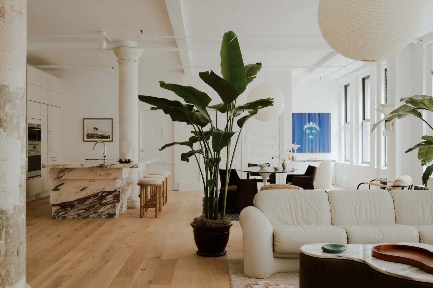 The apartment’s material palette combines textures, softness, and sculptural elements, from luxurious upholstered pieces to the movement of stone textures that mimic the preserved original columns. Thoughtfully placed vintage accents, like a Noguchi light pendant and Andy Warhol artwork, further enrich the design’s eclectic feel. Ultimately, the Flatiron Apartment is a testament to Cojot Designs' ability to transform an industrial loft into a warm, livable home, while staying true to the building’s history and the designer’s personal style.