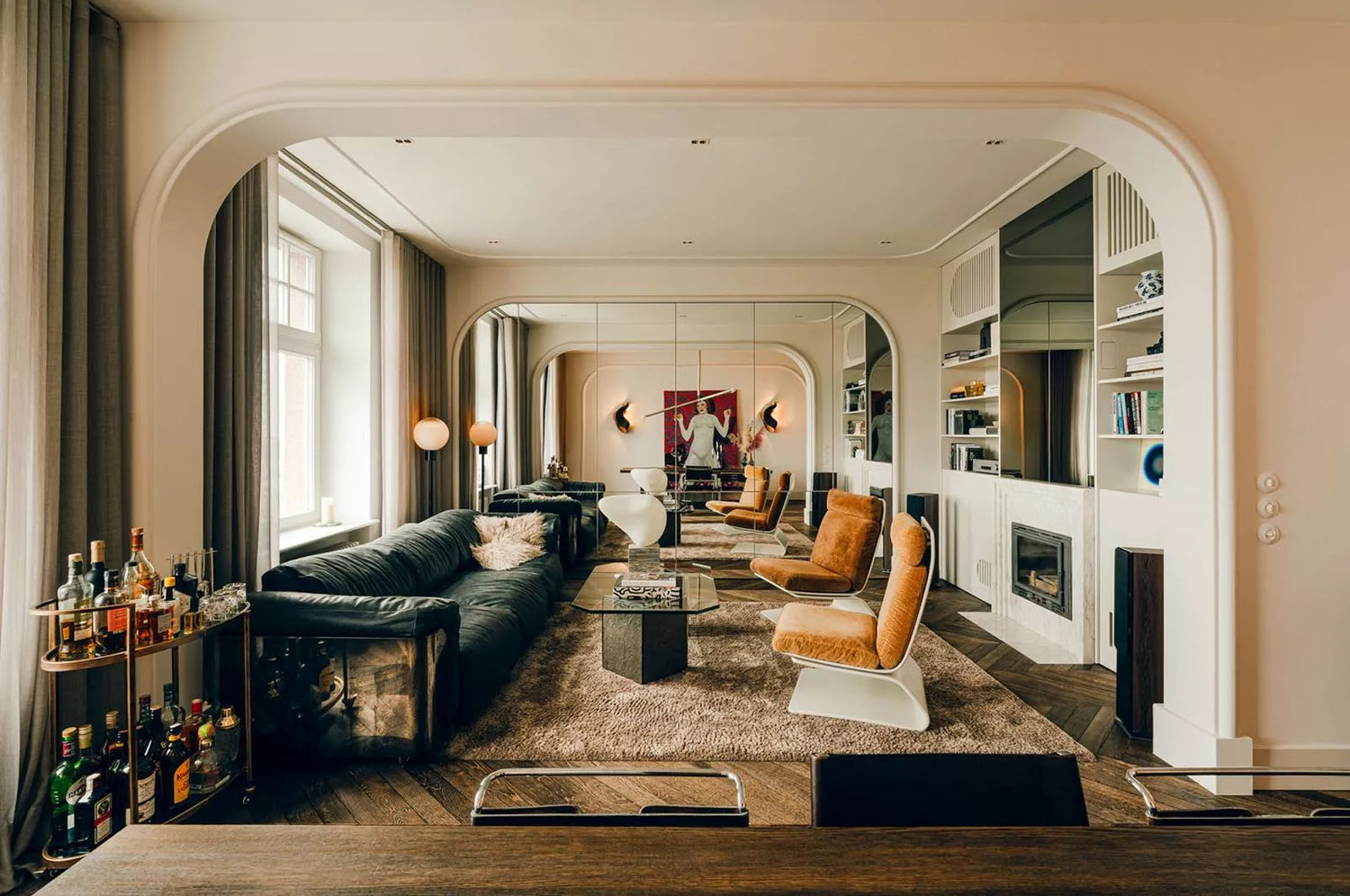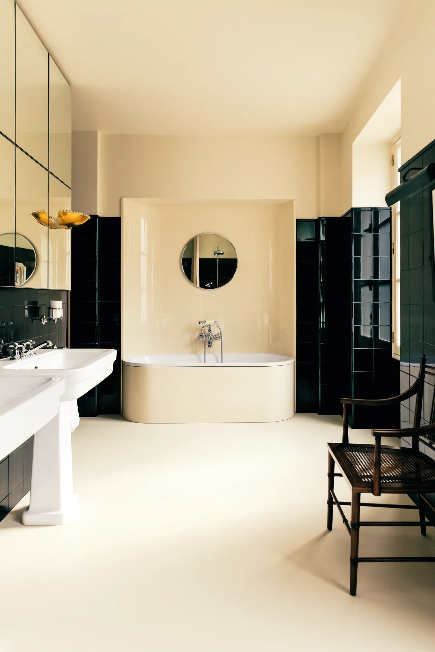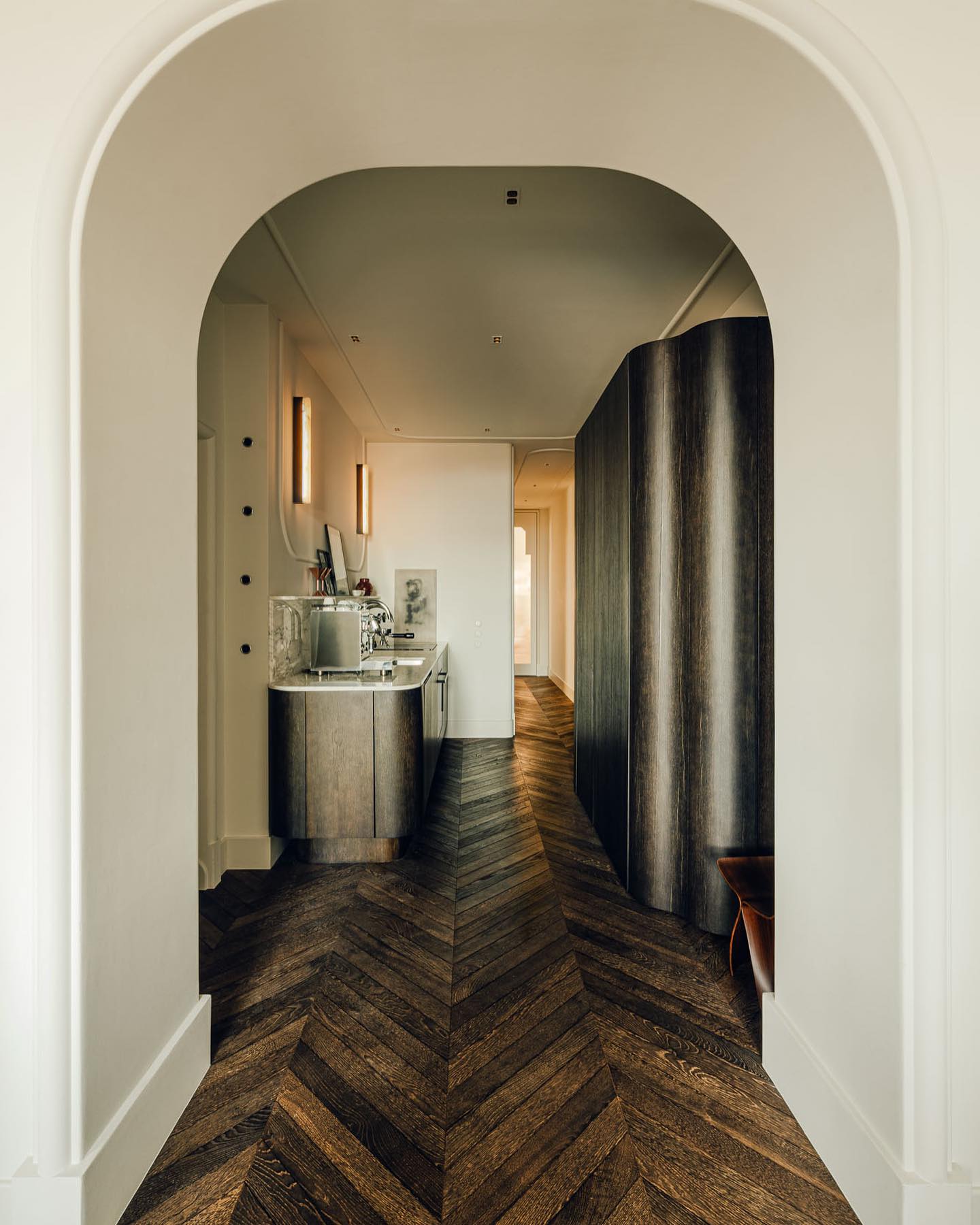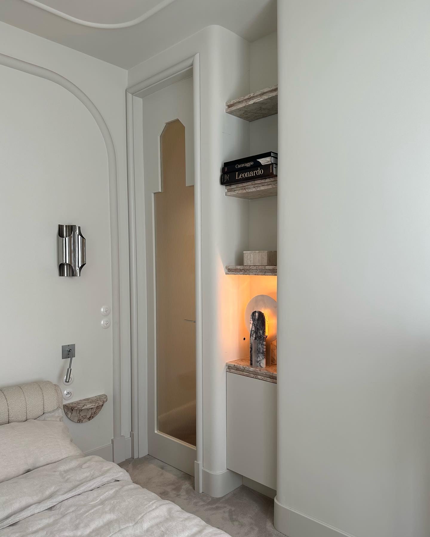 Designing an apartment for Natalia Maczek, the creative force behind the MISBHV fashion label, posed an exciting challenge for architect Katarzyna Baumiller. Maczek’s brand, known for merging streetwear with high-end fashion, has achieved global recognition, and the apartment needed to reflect her unique style. To achieve this, Baumiller examined MISBHV’s portfolio, ensuring the space would resonate with Maczek's vision. Baumiller incorporated rounded forms, sculpted walls, and subtle arches, creating a sense of fluidity while avoiding direct references to traditional designs. Although Warsaw's historic apartments often feature ceiling moldings, Baumiller took a different approach, applying them creatively to walls and architectural details. She extended these flowing lines to mirrors that conceal storage and even into the joints of marble countertops and door frames. These soft curves were intentionally disrupted with more angular elements like trapezoidal shapes, appearing in door glass, furniture legs, and the casing around the marble bathtub, injecting balance and contrast into the design.