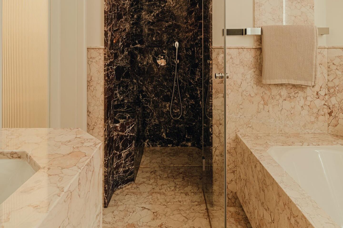 The bathroom itself stands out as a space of relaxation and care. With veined marble that Maczek likens to the stone of the Vatican, it evokes a sense of ritual and indulgence. Complete with the ability to transform the shower into a steam sauna, it encapsulates the balance of luxury and practicality that defines the apartment—a perfect reflection of Maczek's innovative, fashion-forward world.