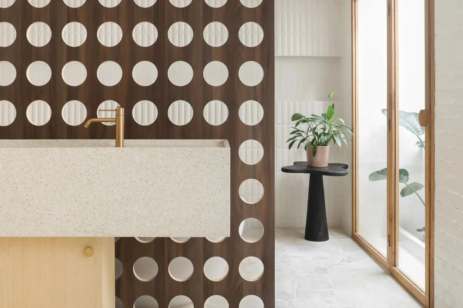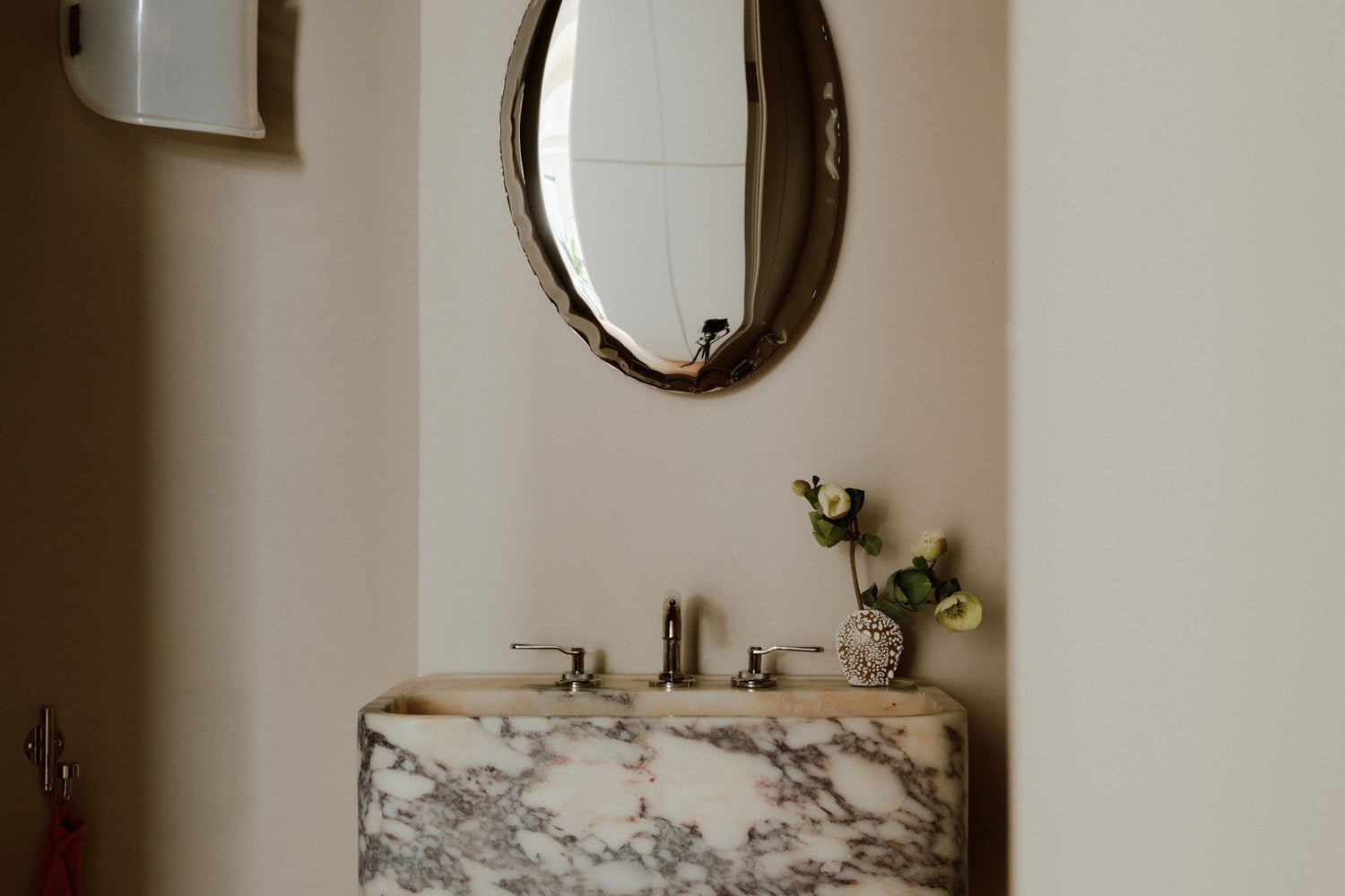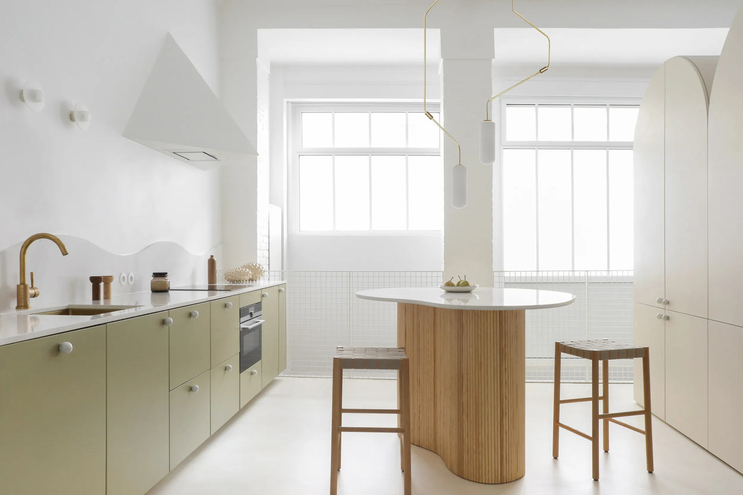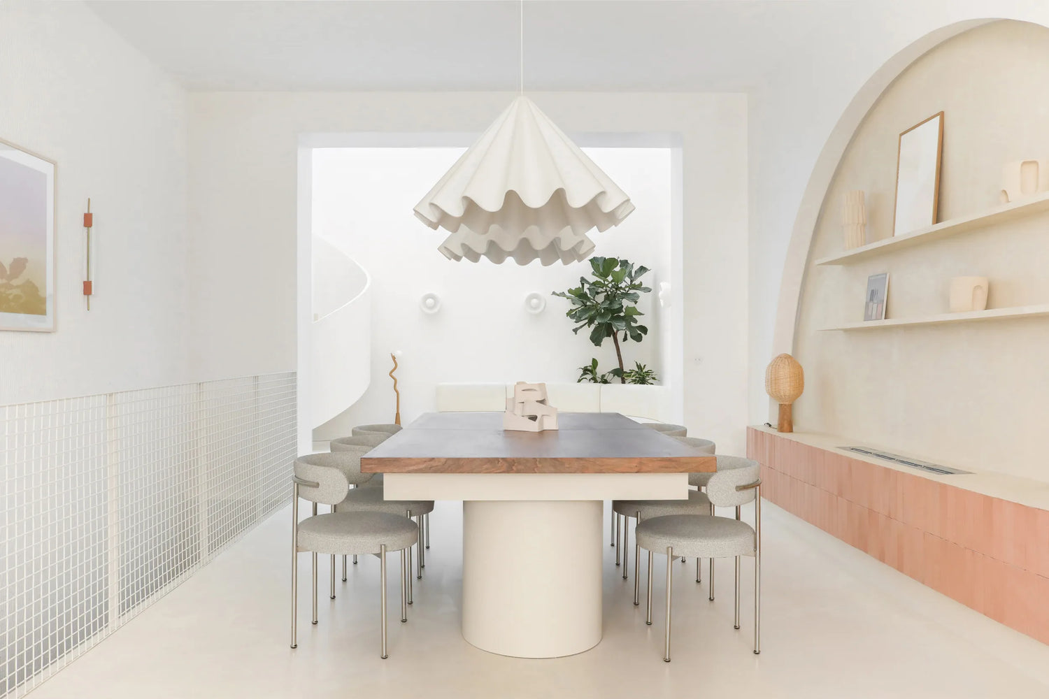 In the kitchen, a custom stainless steel bench pairs with pastel-coloured cabinets, curving gracefully along the wall, while muted berry and pastel tones dominate the palette, enveloping the space in warmth. An organically shaped opening connects the office to the bedroom, enhancing the sense of flow within the apartment. Borgia’s design captures the energy of the neighbourhood while offering a tranquil oasis that reflects the client’s artistic vision, showcasing her ability to sculpt space into a unique and inviting home.