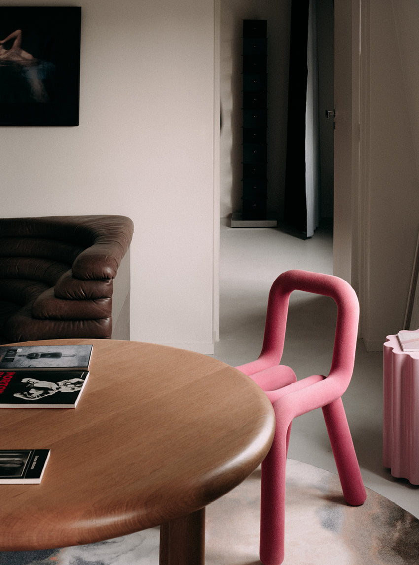 The interior design contrasts raw materials, such as stainless steel and waxed concrete, with softer elements like velvet and leather, establishing a dialogue between rigid lines and supple curves. The living area is anchored by a vintage De Sede Terazza sofa, complemented by a whimsical pink chair from Moustache Editions and a matching Kartell Colonna stool. A custom oak desk and second-hand steel chair further enrich the eclectic decor.