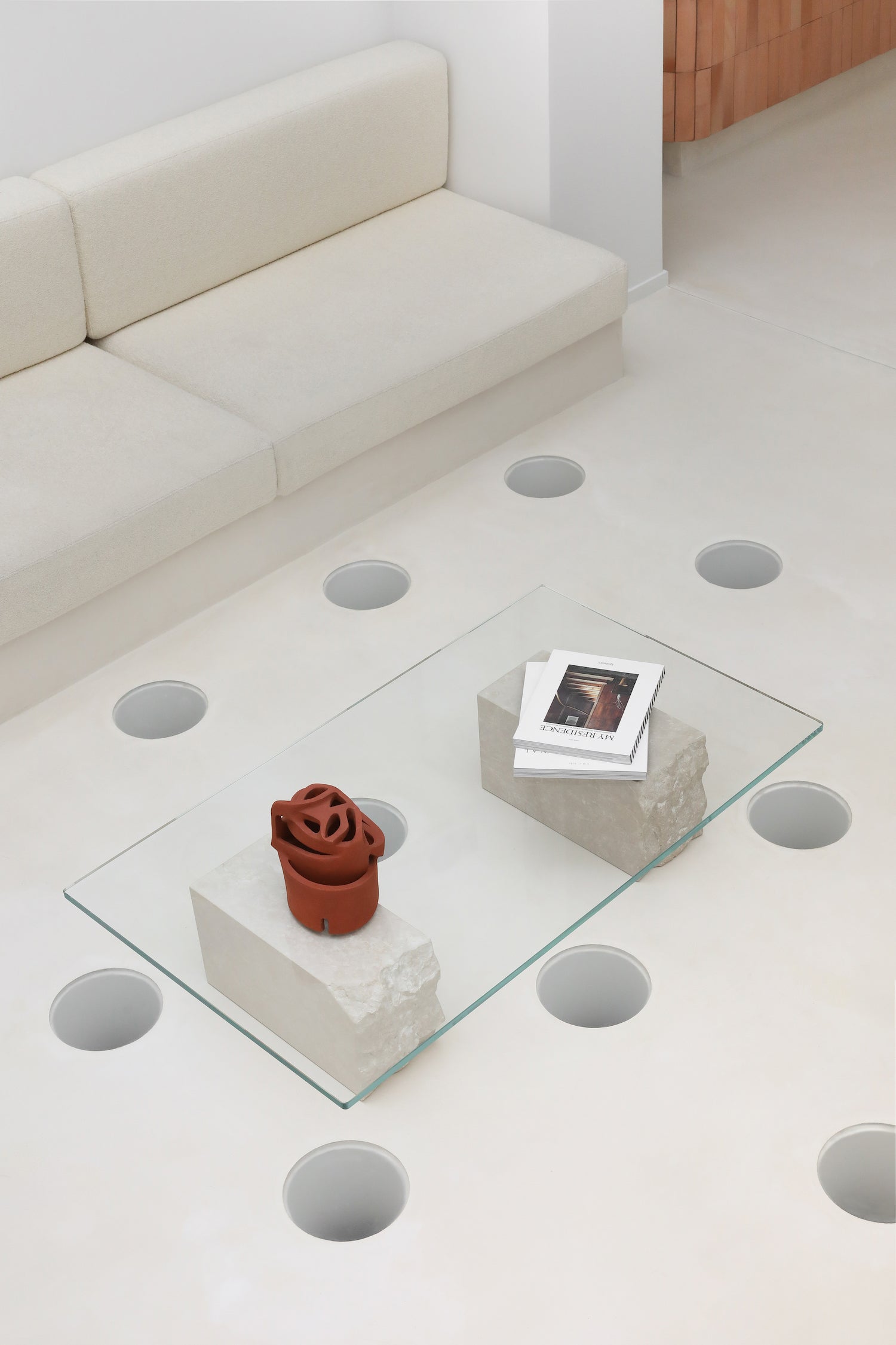 A notable addition to the living room's design is the Noom Low Gropius Chair, chosen for its sleek, modern form. This piece elevates the minimalist aesthetic of the space, blending functionality with a sculptural presence, harmonizing effortlessly with the surrounding architectural elements. Together, these design choices form a cohesive vision, where every detail serves the larger narrative of understated elegance and immersive spatial experience.