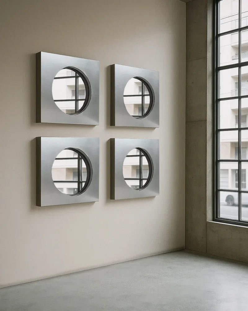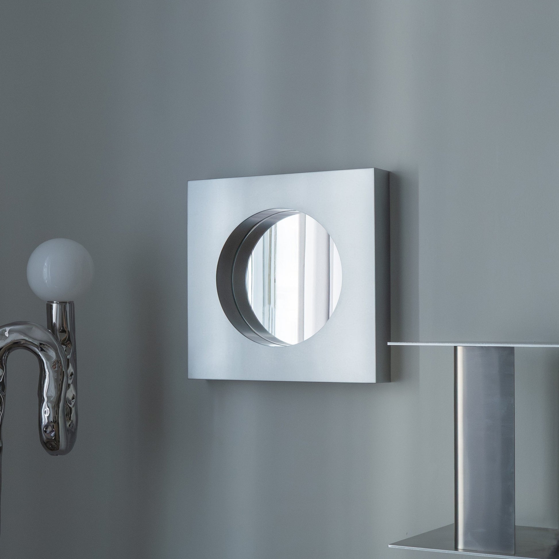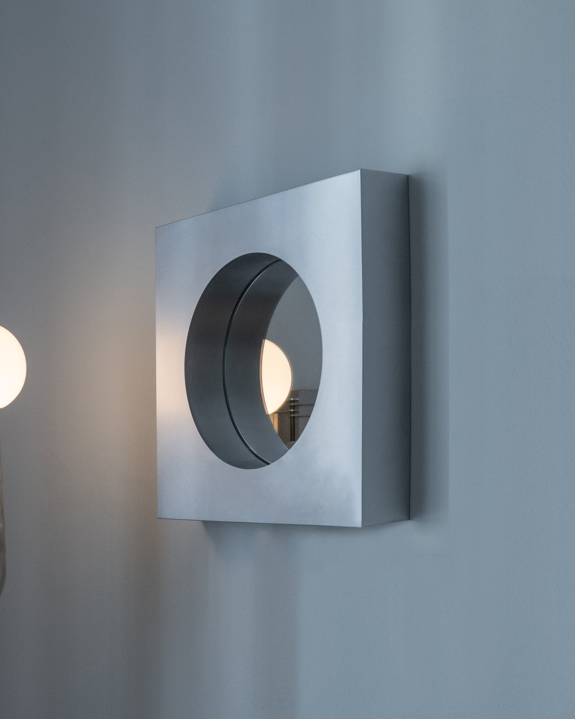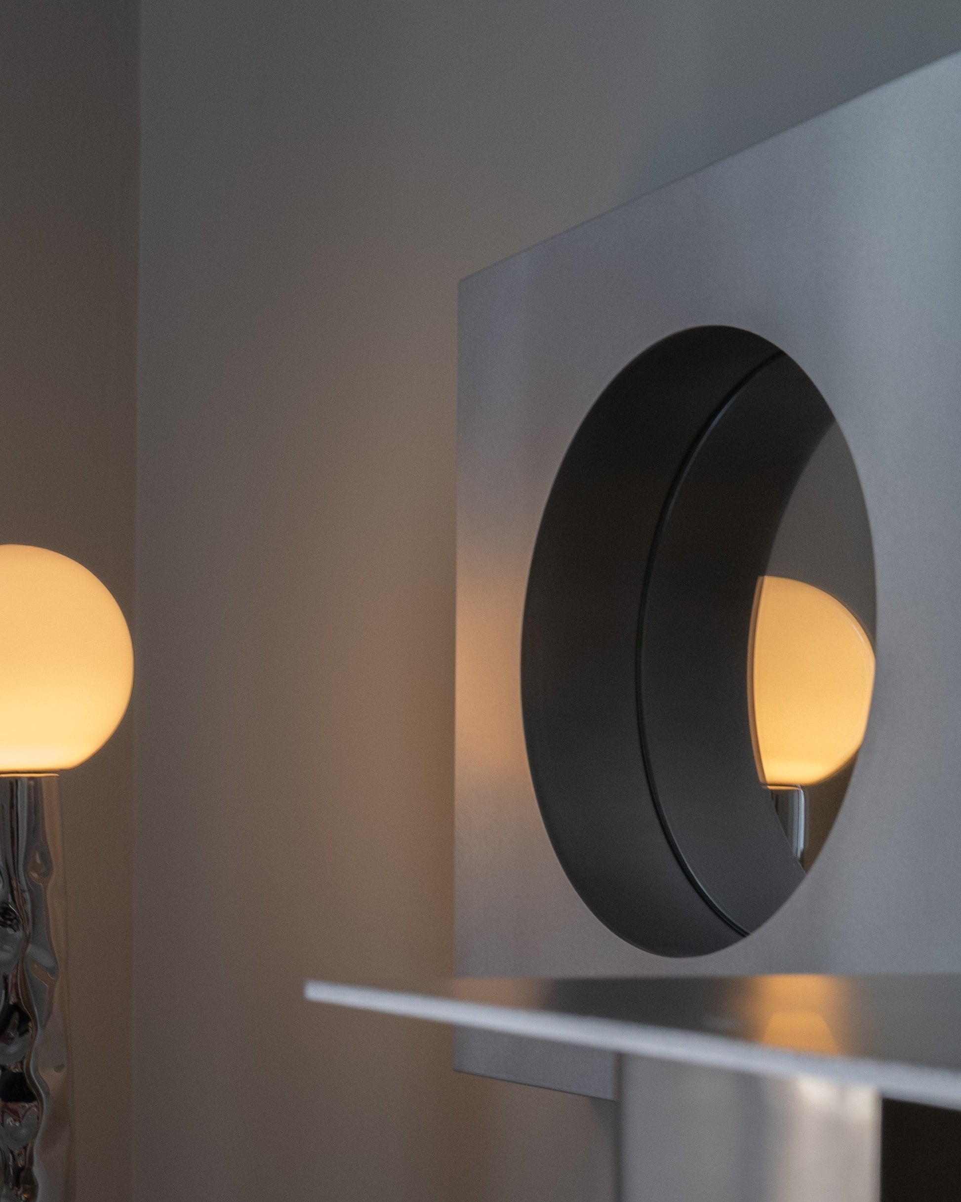The Abbas wall mirror is made in aluminium through the hands of different people and companies. A kind of temporary community formed around a shared goal. That collective involvement is essential in all my work, I want people to feel part of something more than just a product. The concept behind Abbas, with its depth and layered structure, reflects