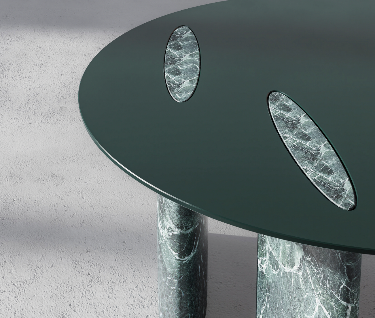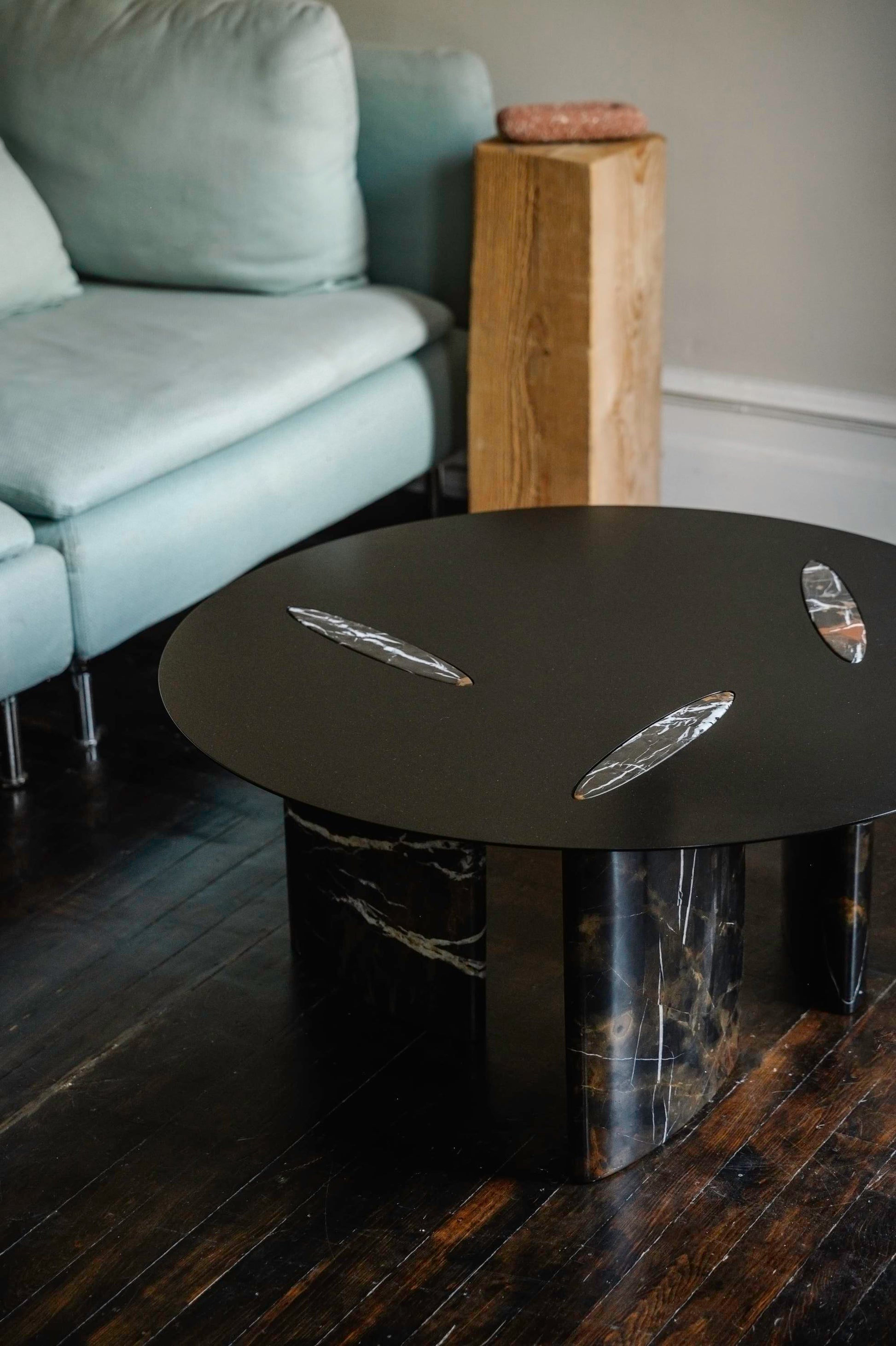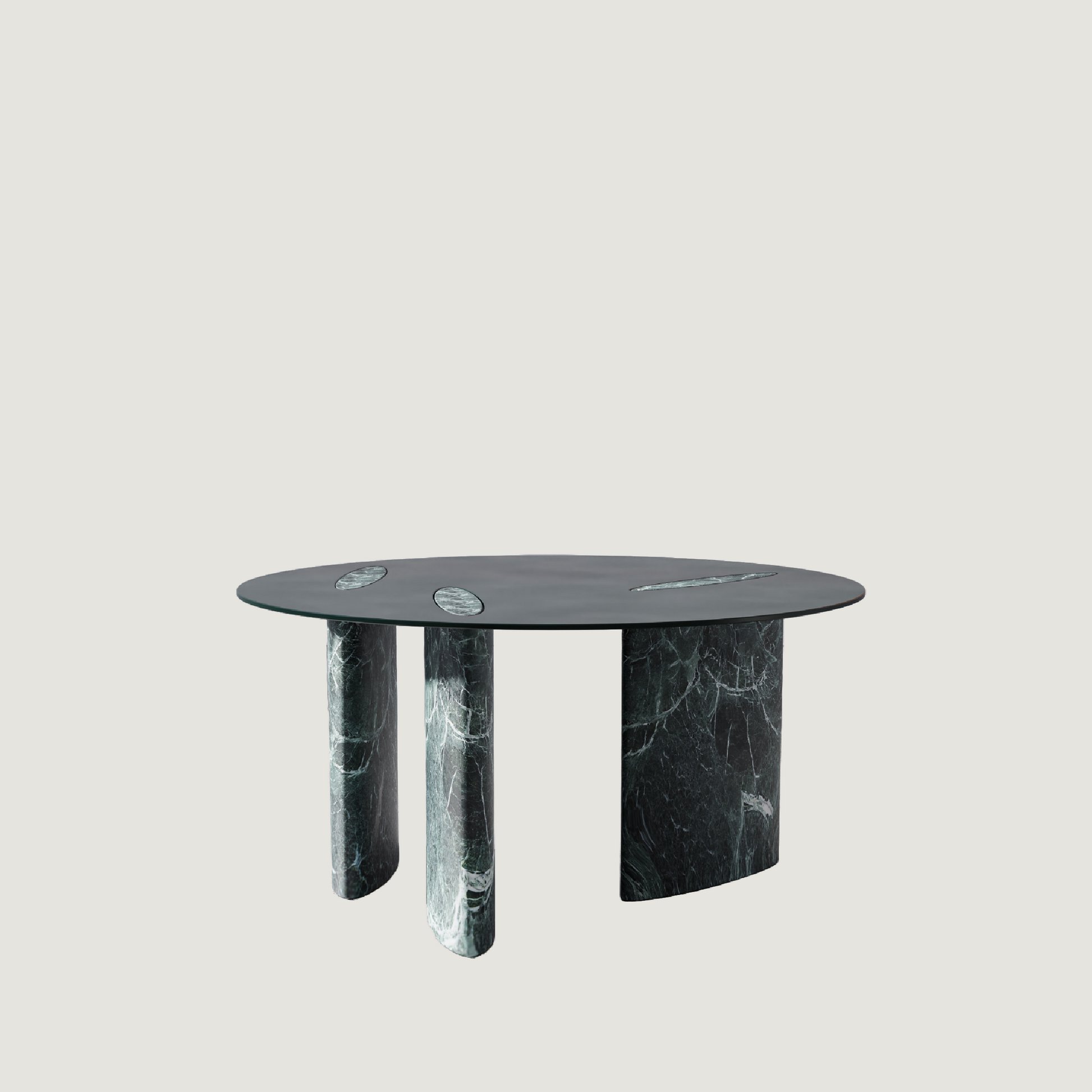 A dialogue between stone and metal, the Drum Coffee Table designed by Studio Drum embodies the essence of our In-House Capsule Collection: a precise handshake between opposing disciplines. The piece utilizes a powerful, geometric form, the circular top supported by three cylindrical legs, repeated to create a dynamic composition. Armani Bronze Marble forms the rich base, its deep, warm brown tones and intricate veining delivering a contemporary feel to a legacy material. This warmth is grounded by the sleek, dark minimalism of the powder-coated steel tabletop. Silhouettes of the richly veined marble gently peek through the precision-made metal surface via unique inlays, delivering notes of compelling visual intrigue. Like the Modulo collection, this piece is fully customizable in size and surface material, allowing the luxurious textures and colours to harmonize perfectly with any residential or commercial application.