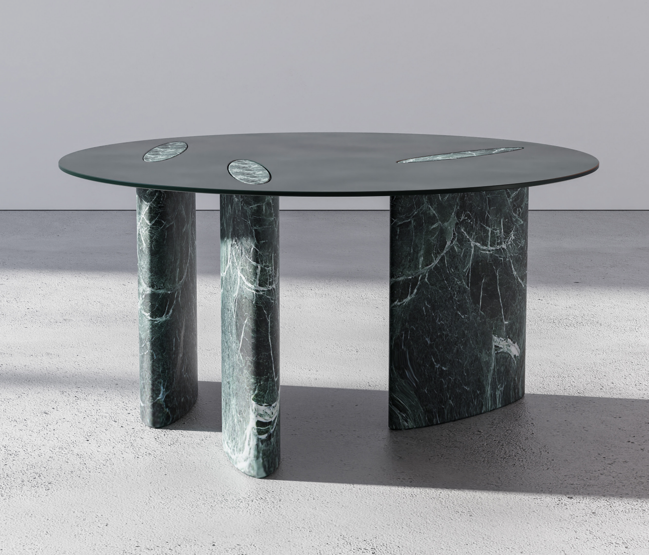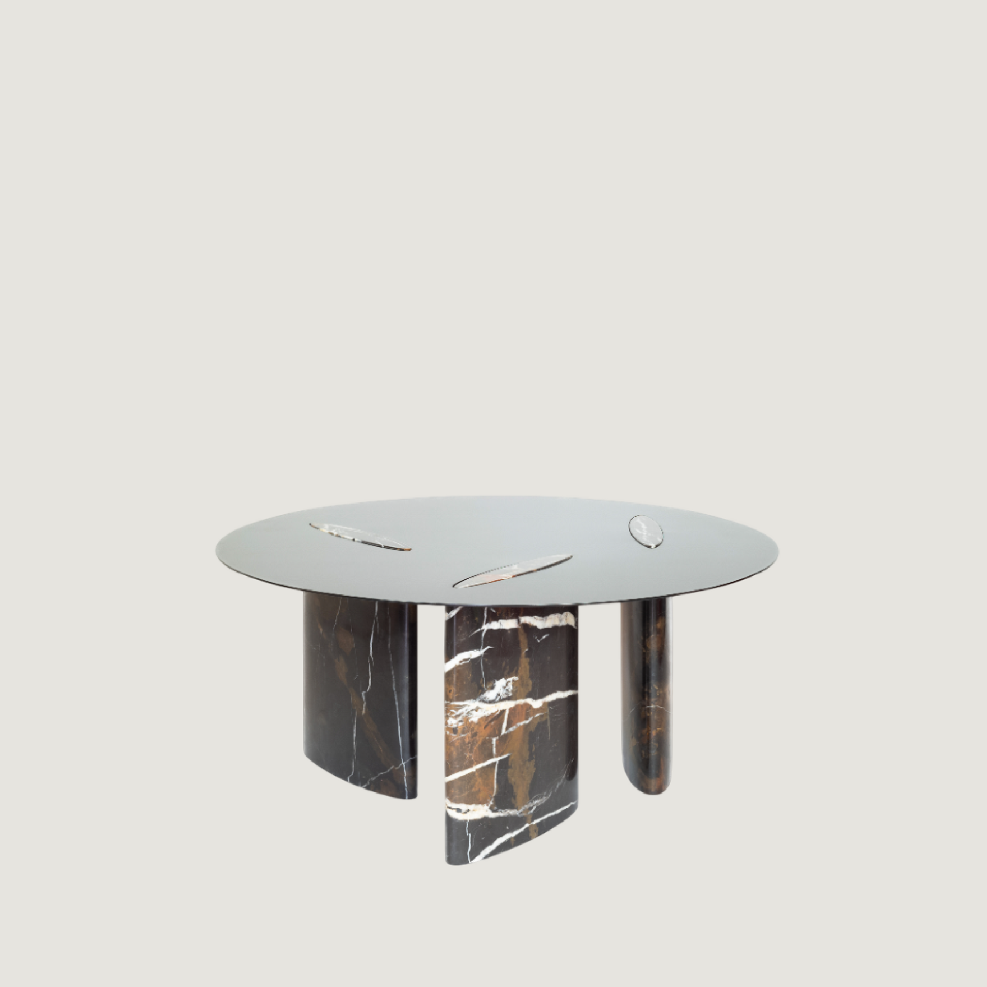 A dialogue between stone and metal, the Drum Coffee Table designed by Studio Drum embodies the essence of our In-House Capsule Collection: a precise handshake between opposing disciplines. The piece utilizes a powerful, geometric form, the circular top supported by three cylindrical legs, repeated to create a dynamic composition. Armani Bronze Marble forms the rich base, its deep, warm brown tones and intricate veining delivering a contemporary feel to a legacy material. This warmth is grounded by the sleek, dark minimalism of the powder-coated steel tabletop. Silhouettes of the richly veined marble gently peek through the precision-made metal surface via unique inlays, delivering notes of compelling visual intrigue. Like the Modulo collection, this piece is fully customizable in size and surface material, allowing the luxurious textures and colours to harmonize perfectly with any residential or commercial application.
