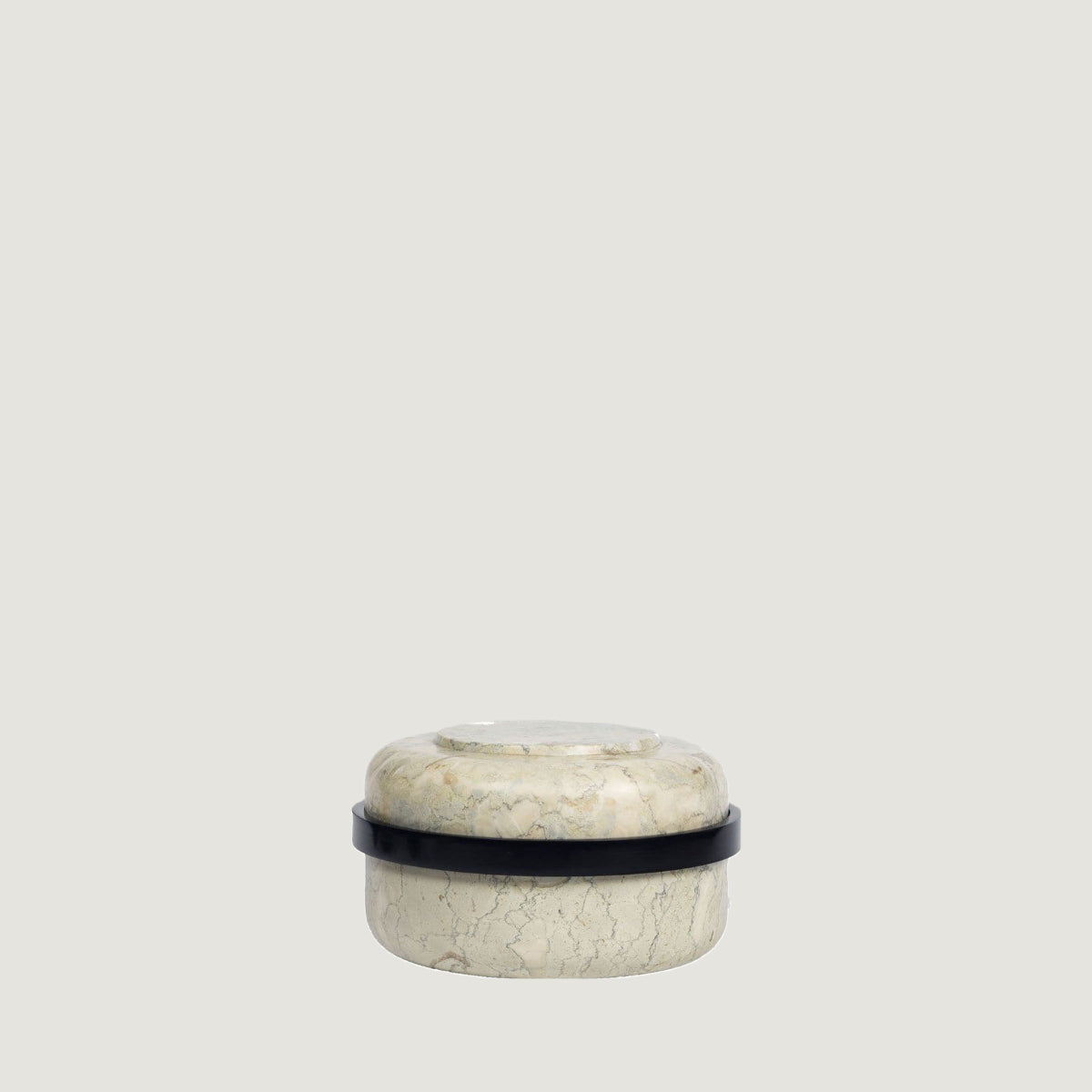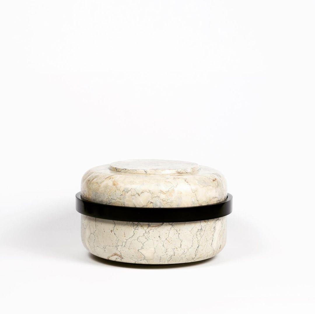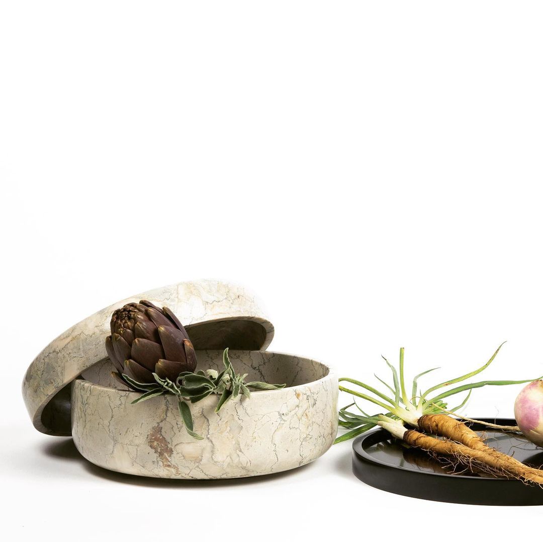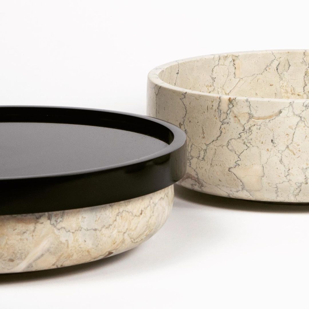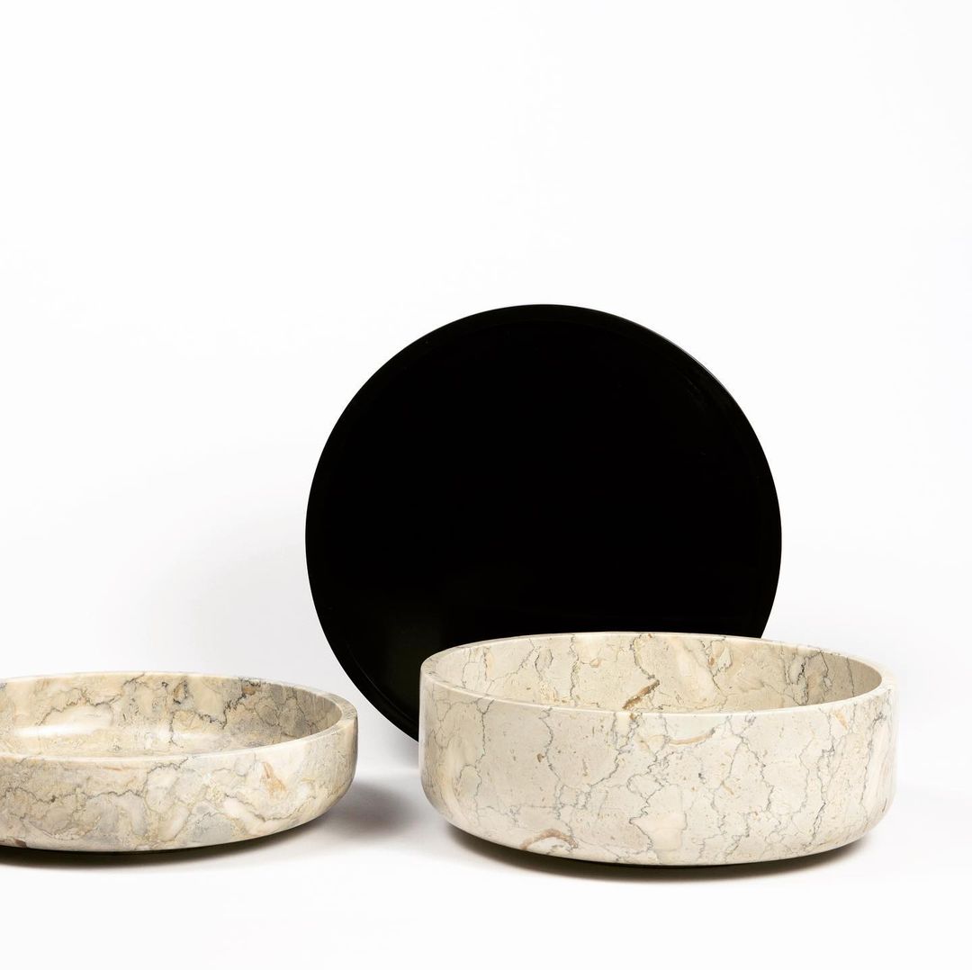 A collection of marble containers made up of 2 elements and held together by a Corian element designed for everyday domestic life and ready to welcome and offer hospitality. Versatile objects that adapt to multiple uses, from simple containers for the home to serving trays and bowls when they are separated and used on the table. They are produced on a manual lathe and with a numerical control work center