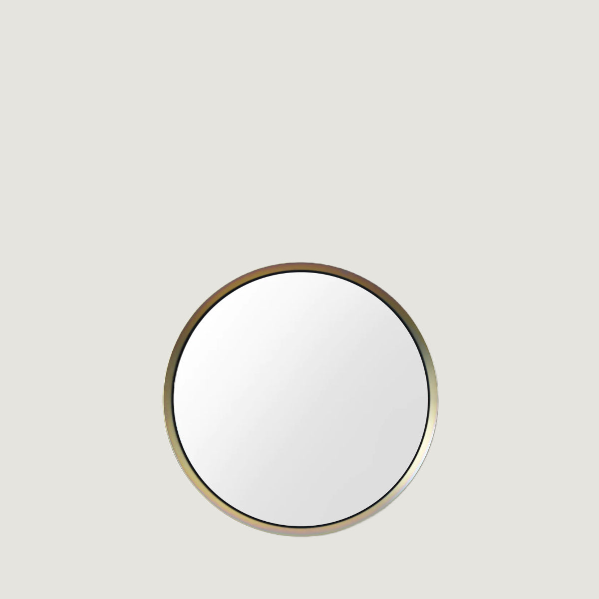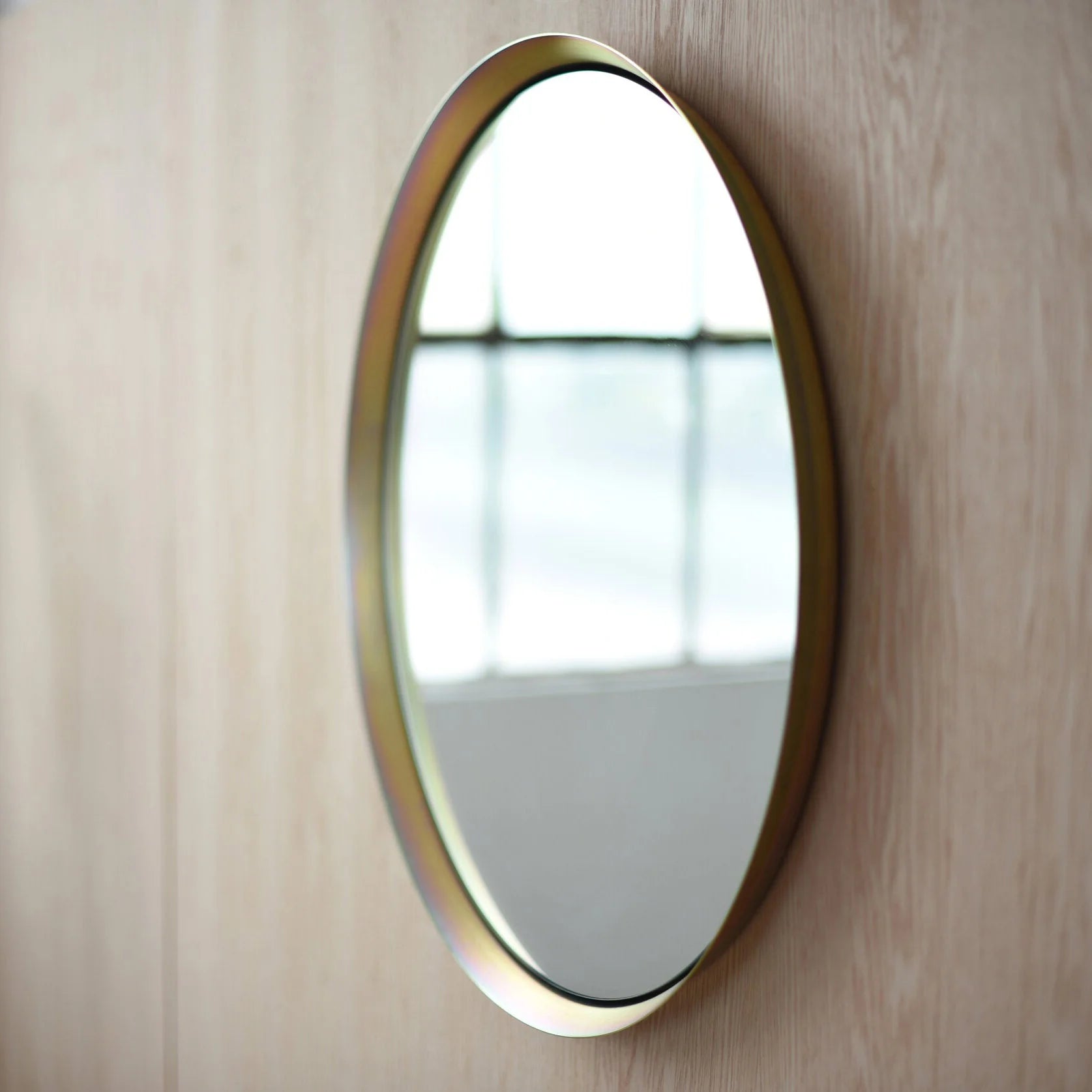 Kendrick’s glass mirror is suspended within a spun steel frame, creating a dark shadow line, and a unique graphic visual. This distinctive, yet simple mirror fits well in a variety of rooms, from bathroom to living room. The iridescent finish reveals the depth and richness of steel spinning process. Each piece is unique and may contain minor irregularities