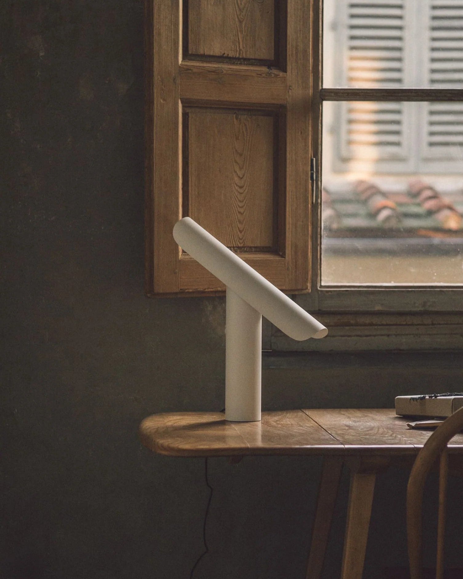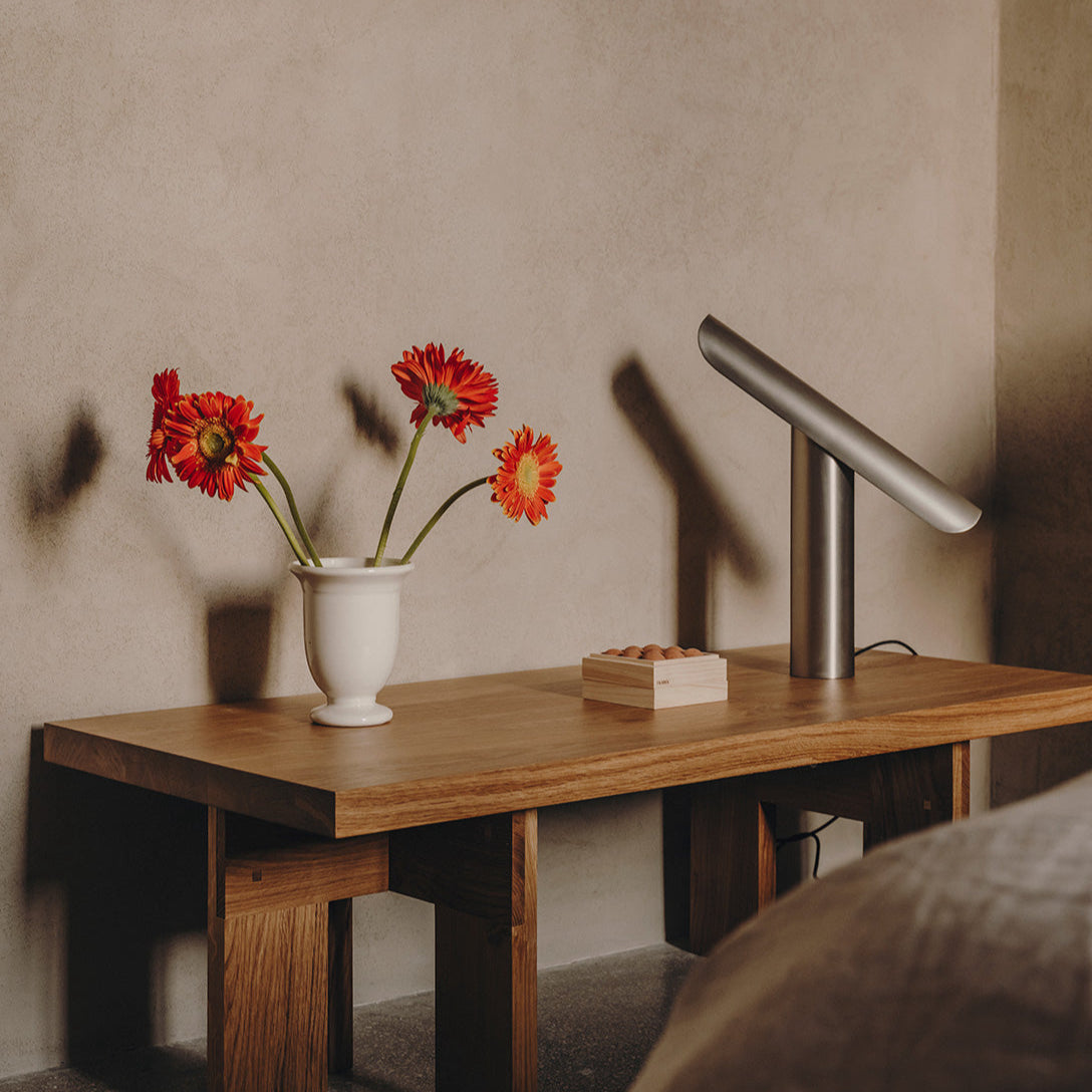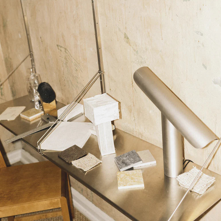 Available in three refined finishes — brushed brass, brushed steel and White — the T-Lamp’s surfaces are texturally rich and left intentionally raw, allowing the material to develop character over time. Whether placed on a desk, console, or used as a standalone object, it offers a presence that is both quiet and commanding.